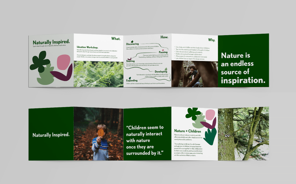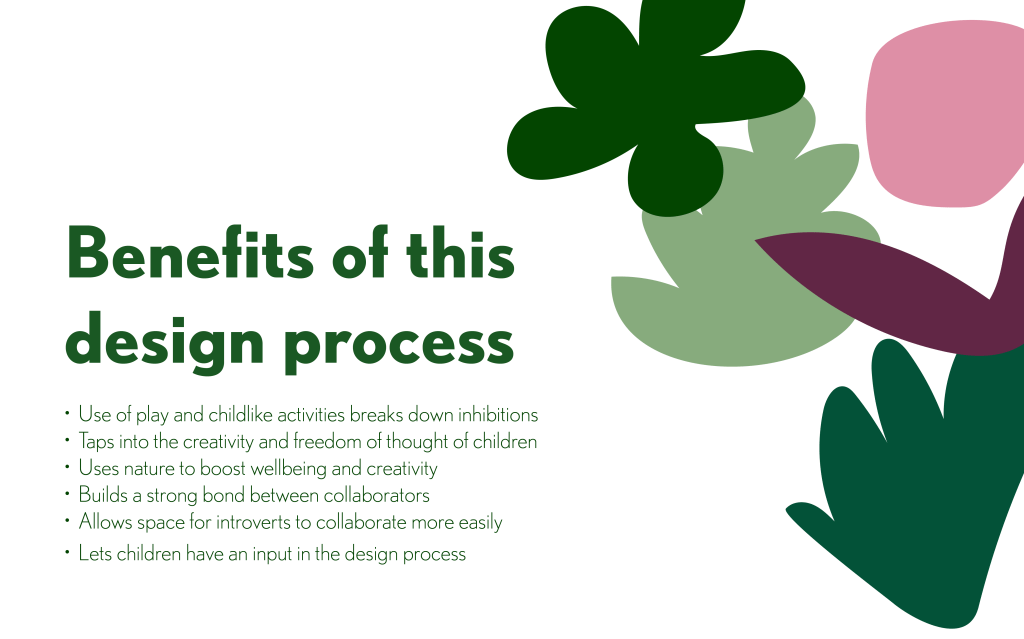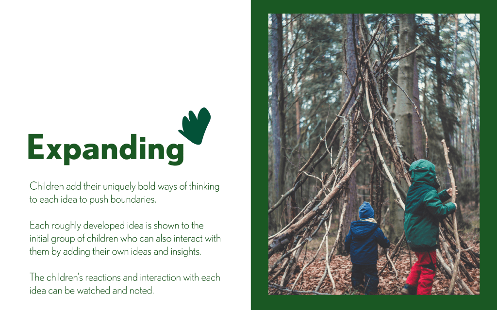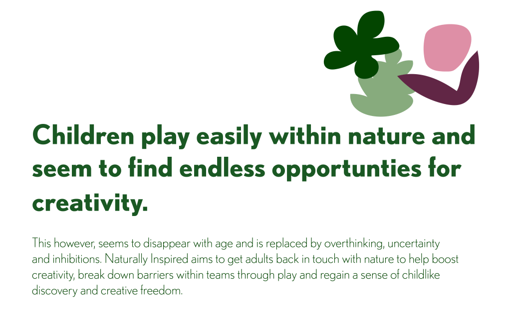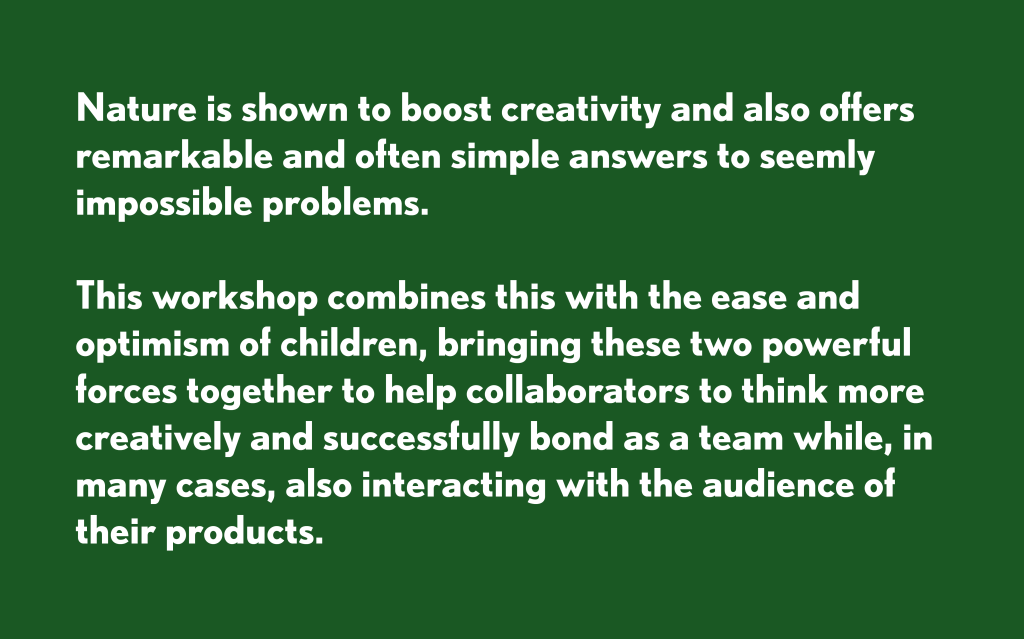Children seem to have endless creativity and no inhibitions. Nature is shown to boost creativity and also offers remarkable and often simple answers to seemly impossible problems. Bringing the two together is a way to help collaborators to think more creatively while also interacting with the audience of their products.