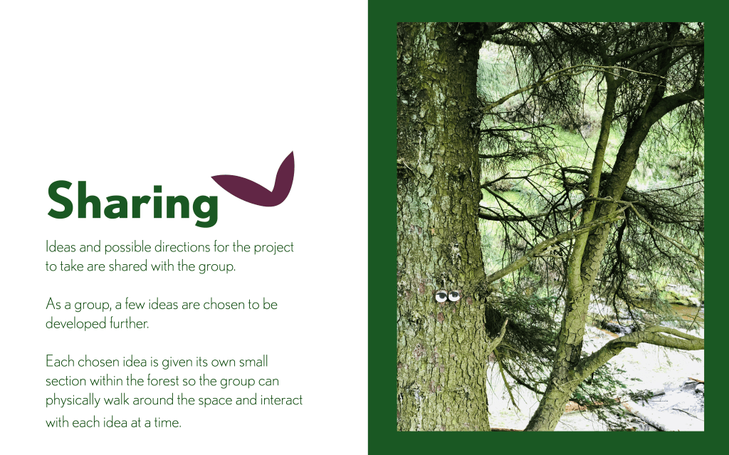 3- Define – Share possible ideas with the group, each idea is given its own small section within the forest so the group can physically walk around the space and interact with each idea at a time.