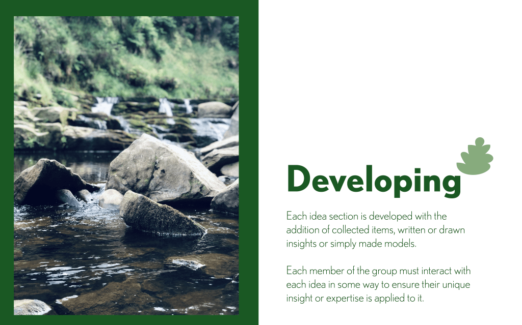 4- Develop – the group can collect things and bring them to each section, write or draw ideas or insights in that section. Create simple models etc. Each member has to interact with each idea in some way bringing their unique insight into it. That way each individual perspective is brought into each idea.
