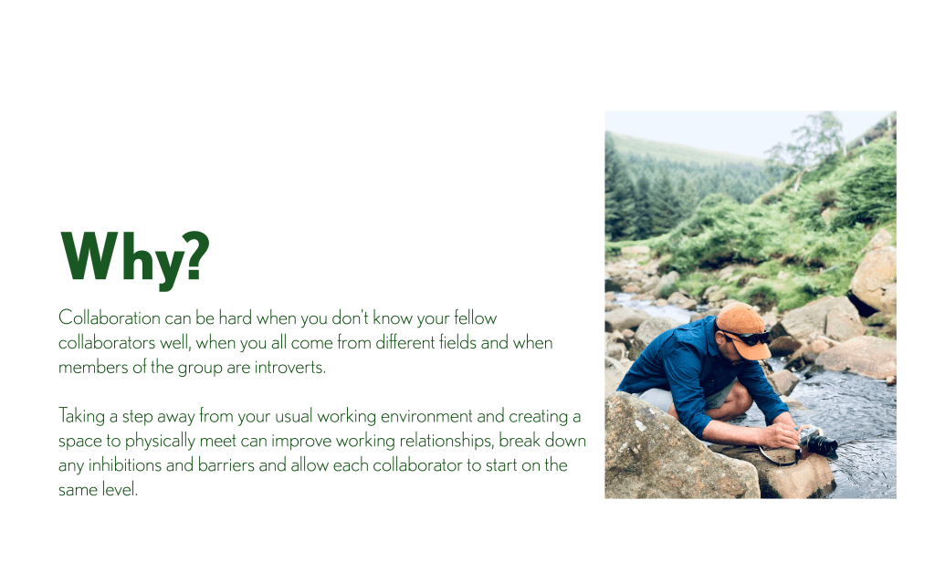 Collaboration can be hard when you don’t know your fellow collaborators well, when you all come from different fields and when members of the group are introverts. Taking a step away from your usual working environment and creating a space to physically meet can improve working relationships, break down any inhibitions and barriers and allow each collaborator to start on the same level.