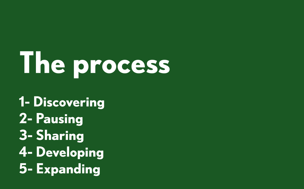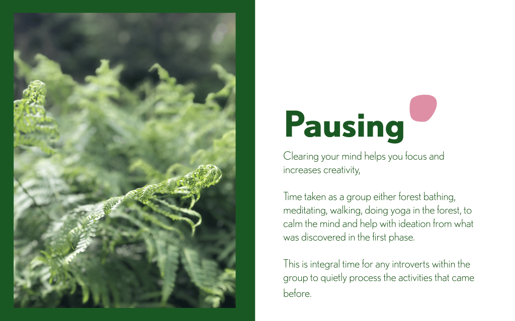 2 – Pause – Time as a group forest bathing/meditating/walking/doing yoga in the forest to calm the mind and help with ideation from what was discovered in the first phase. (This is also linked to the idea of how introverts need time to quietly process collaborative work and thoughts that I explored last week.)