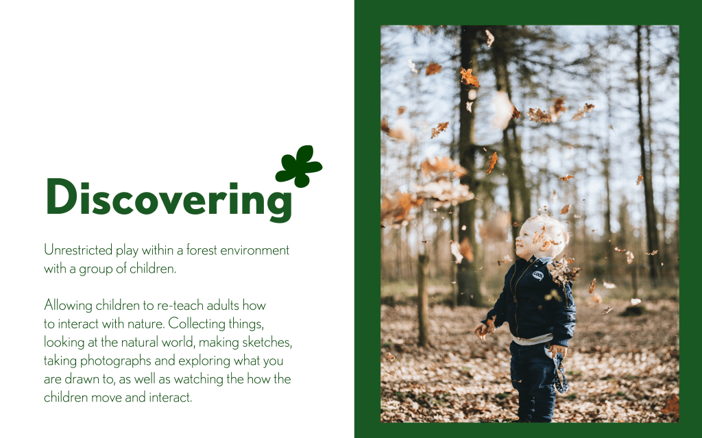 1 – Discover – Playing within a forest school environment, with a group of children. Discover how they interact with nature, speak to them about their ideas and views and create things with them. Collaborators will also play and move around in an unrestricted way within the natural environment. Collecting things, looking at the natural world, making sketches, taking photographs and exploring what you are drawn to. It is important for the children to be there to teach adults how to do this as its something that becomes un-natural to us as we grow up.