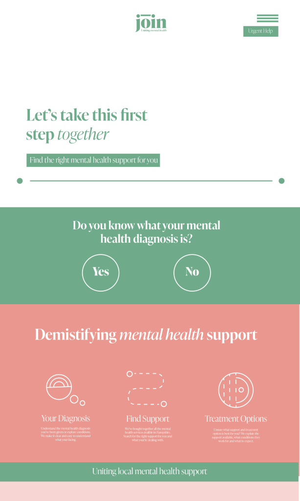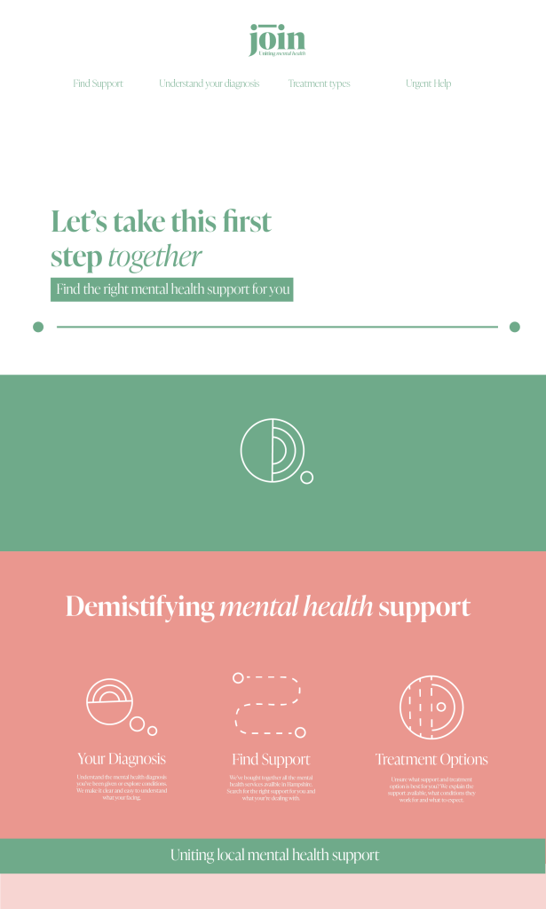 Therefore from the potential directions I explored last week, I have decided to take the website idea forwards. Despite being quite ordinary in comparison to the other ideas I explored, I think with my challenge in mind, it is the best way to deliver clear and useful advice to people struggling with their mental health. Anything more exploratory could be very powerful in raising awareness of mental health struggles, but I want to use design as a communication and clarification tool. It is the lack of design in many common mental health websites that are what cause them to be complicated and overwhelming. So I want to use design thinking and clarity to make accessing local, free mental health support easier.