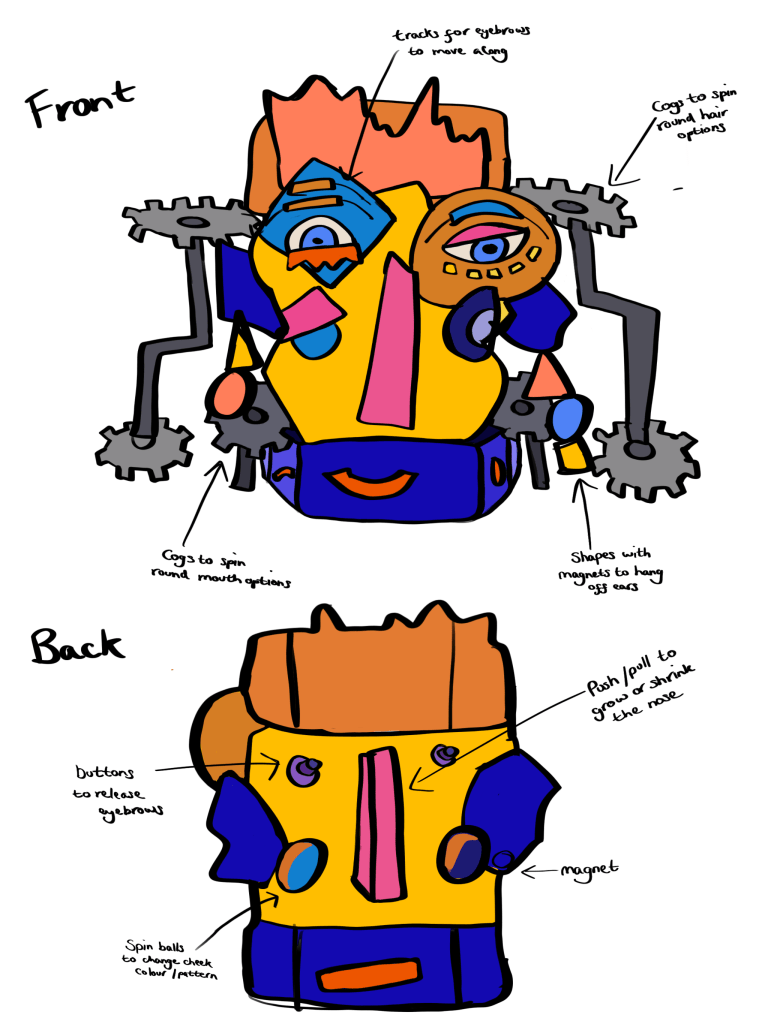 I created some sketches of how the potential parts of the face could move. I want to use alot of visible cogs and machinery which is large and tempting for people to engage with. I also want the way that parts move to be slightly unclear but simple to use. That way people have to work it out for themselves, but won’t get discouraged by not being able to use it. This will be a difficult balance to hit and I may need to make some models and test out the mechanisms with people to see how easily they work them out.
