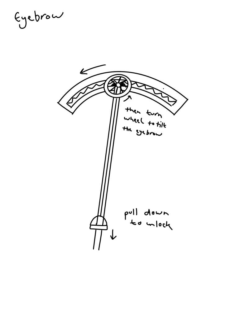 After looking at this i came to the conclusion that placing the eyes on separate poels to the eyebrows could make both sections easier to use. I also decided that the decoration under the eyes (or the eyelashes) could be utilised as part of the mechanism – giving people something to pull down.