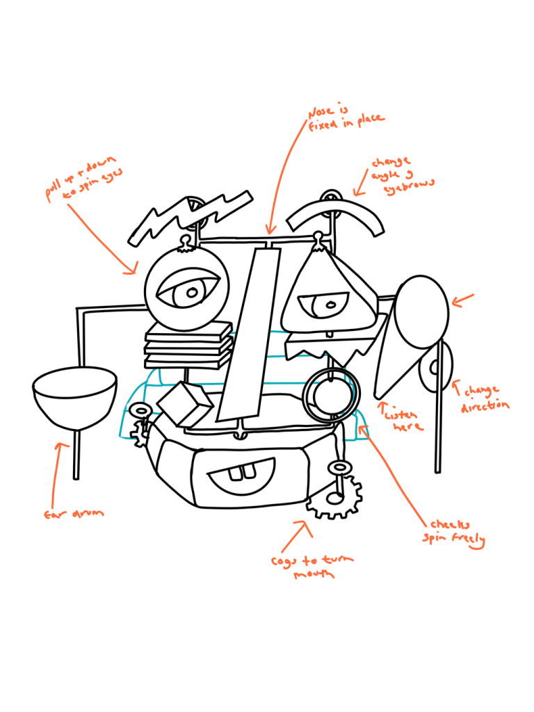 For the mouth section I looked at getting an octagon to rotate revealing different mouths. To turn the shape around two separate cogs would need to be turned on either side of the shape – so one person would be unable to do it alone, you need two people to make it work and possibly even a third to select the desired mouth.