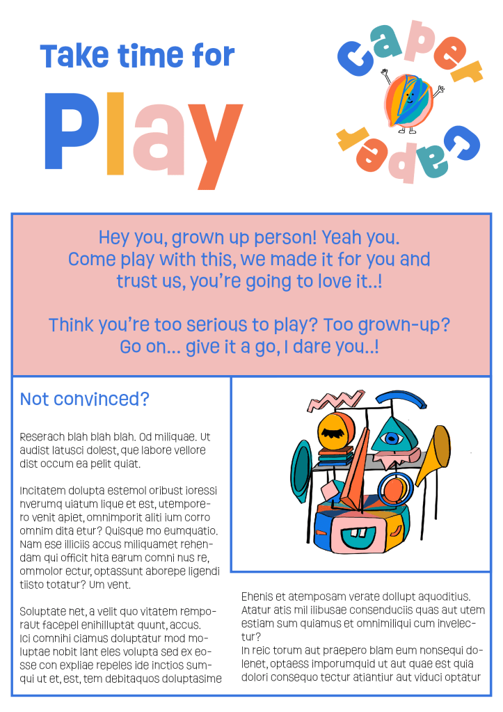 I LOVE THIS! And I would totally play! I think it’s ahead of the trend too – mindfulness colouring books and even the national museum lates show that adults want and need the play. I like your colour palette as it feels playful but mature. And the hand drawn illustrations are great as Yara and Courtney say. – Lizzie, Designer