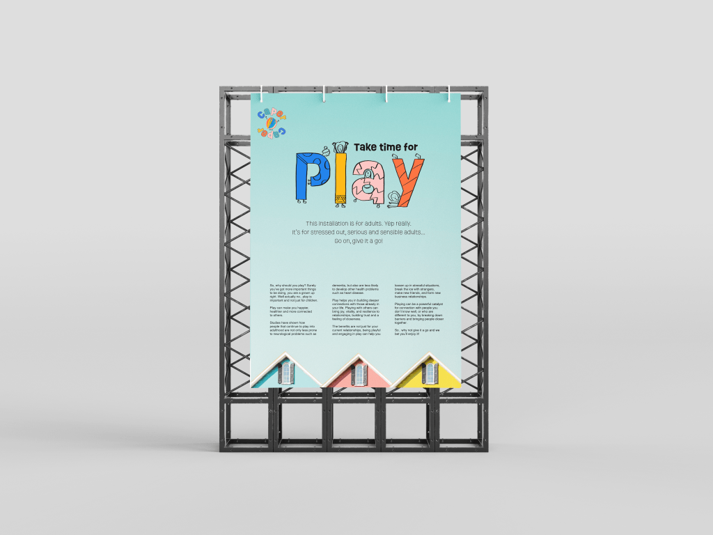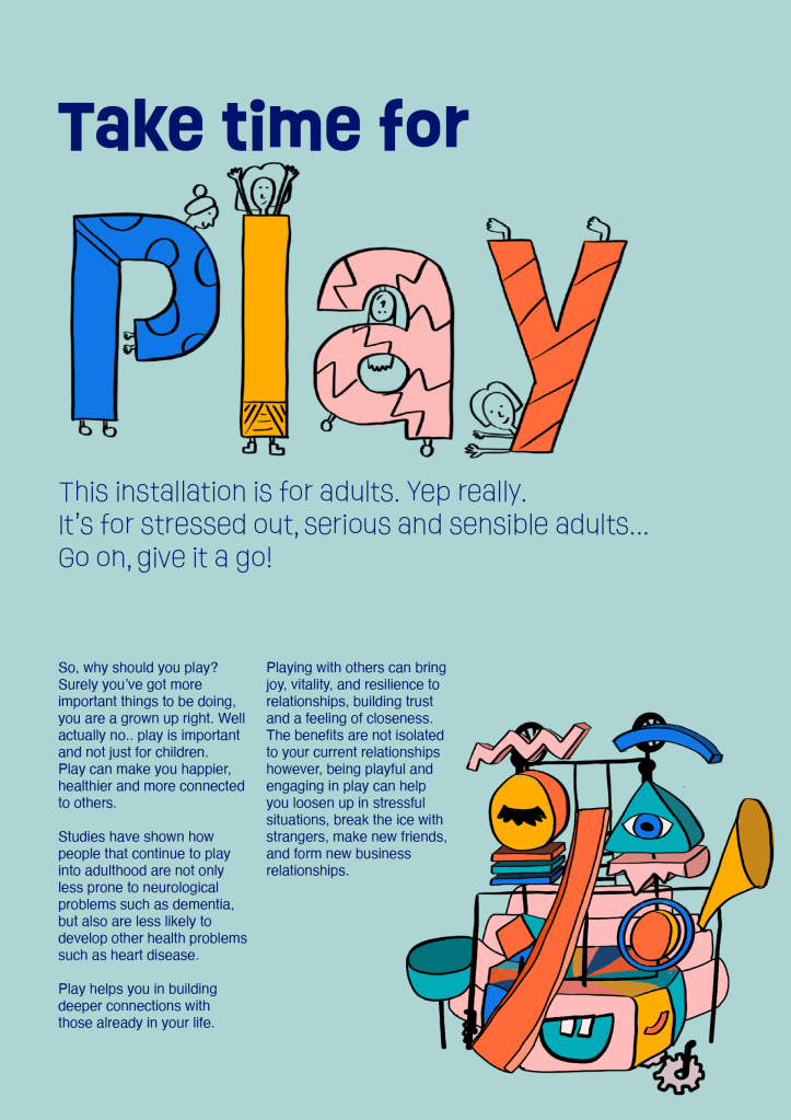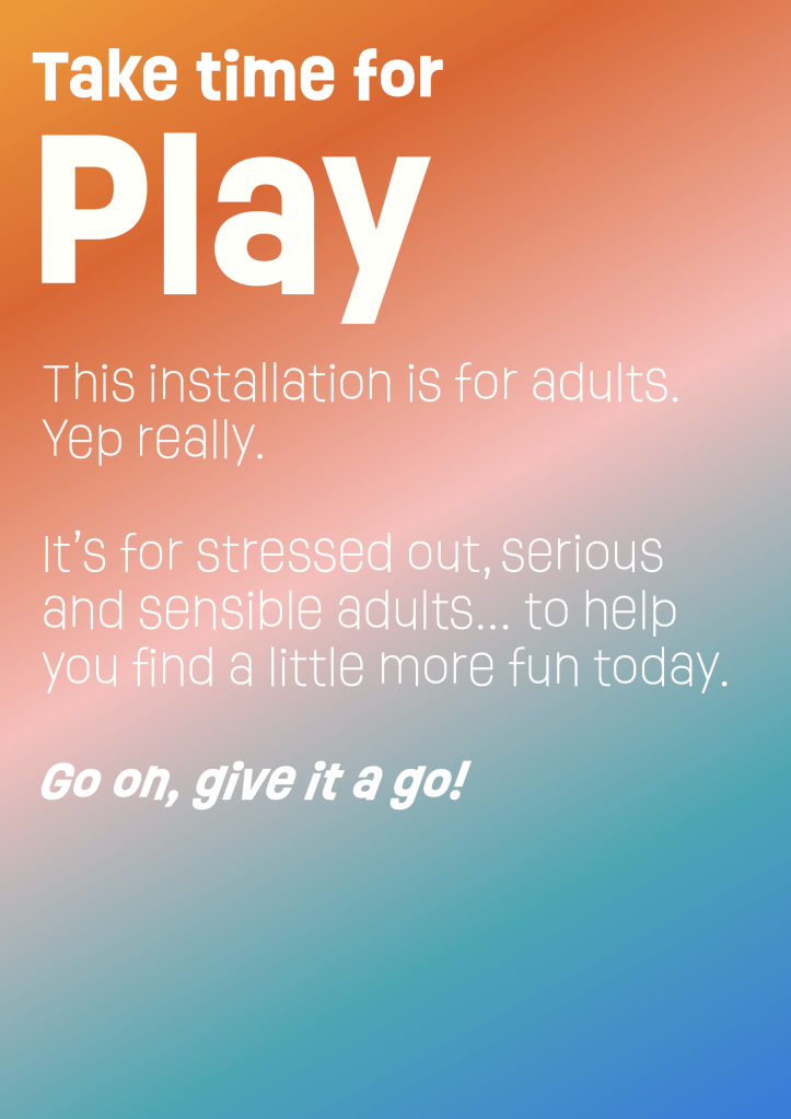 I do think that marketing around the installation, both digital including social media and physical marketing would be beneficial to spread the word and spread the message of adult play further afield, in the hope of sparking more projects and research into it as an idea as well as simply inspiring adults to want to play directly.