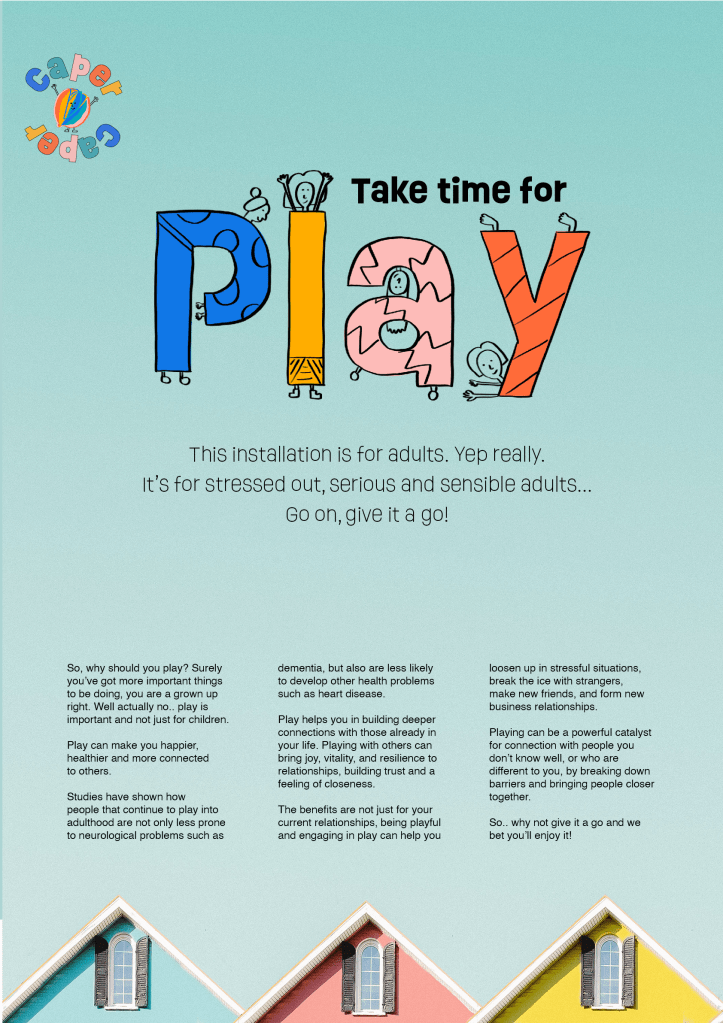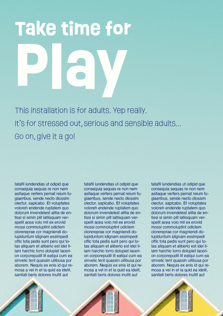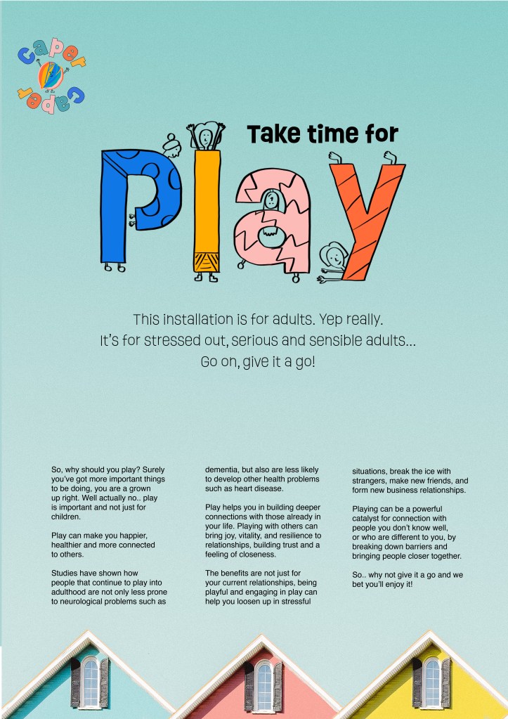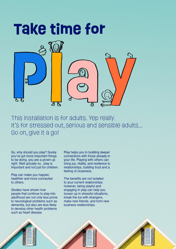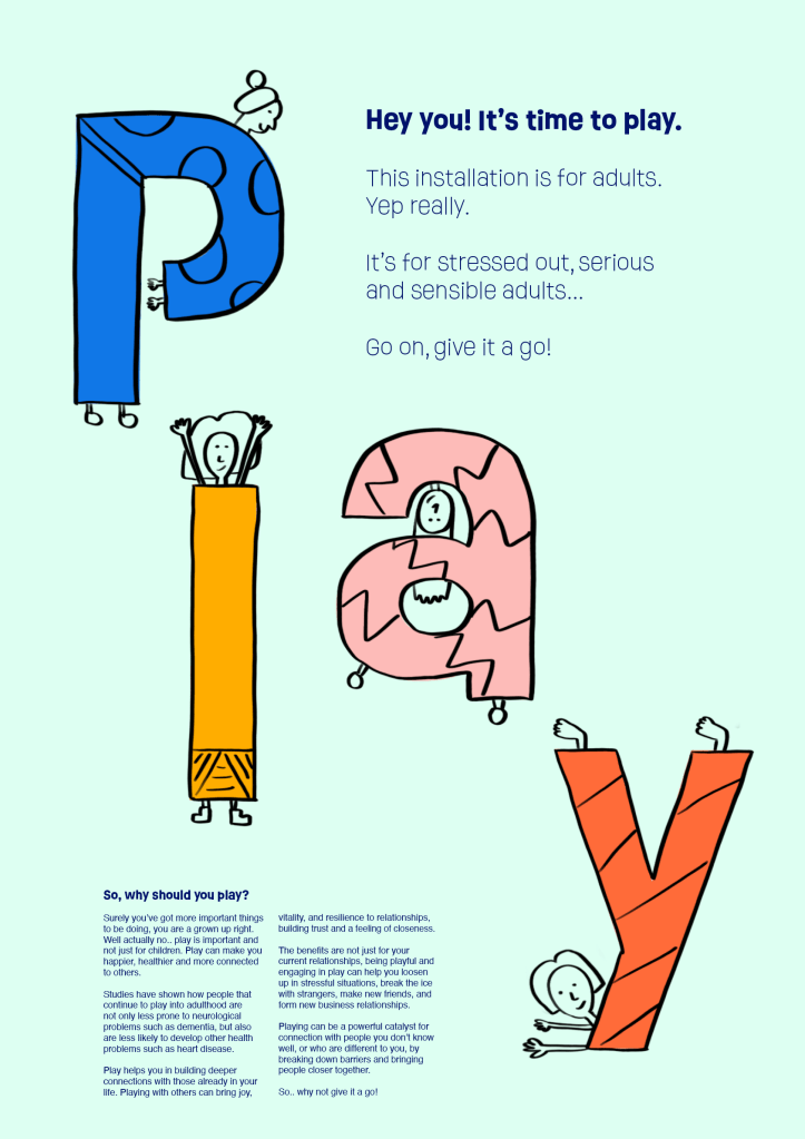 I started designing up the sign that would sit alongside the installation to explain what it is and give adults the ‘permission’ they are always looking for to allow them to play comfortably.